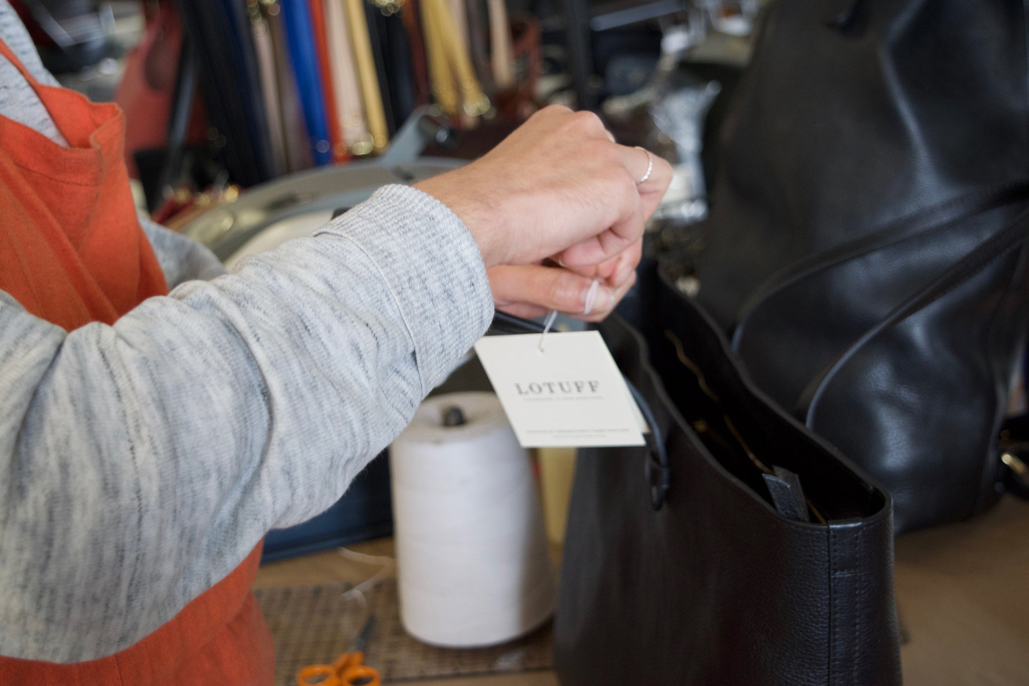 After being passed through so many hands and under so many sets of watchful eyes, inspecting a bag is our final “test” to ensure that no marks or blemishes can be seen, no stitch is out of place, and no edge paint is uneven. Once we’re totally sure that each of these No. 12 Totes is the best it can be, a hangtag is affixed and a registration card tucked inside to herald our lifetime guarantee. Then, every inch of the tote is given a final shine with our leather elixir to condition and defend it against superficial wear-and-tear.